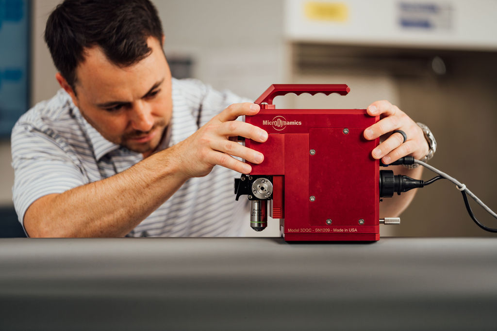 3DQC Classic™ Anilox Roll Microscope, where seeing is believing! The 3DQC from Microdynamics uses white light interferometry, the ultimate non-contact measurement technology for the greatest accuracy. Speed and ease-of-use combined with measurement repeatability within 1% makes the 3DQC Classic™ nearly unbeatable by any other anilox roll microscope. This rugged, portable quality control tool is trusted by anilox OEMs far and wide.